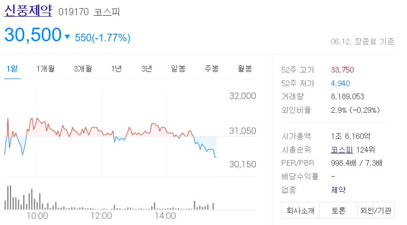 신풍제약 또한 1만원대 밑이었던 주가에서 계속해서 올라 현재는 3만원대까지 주가가 상승하였습니다. 신풍제약 또한 원재료를 취급하는 회사기 때문에 렘데시비르 관련주로 묶여 주가가 많이 오른 케이스입니다.