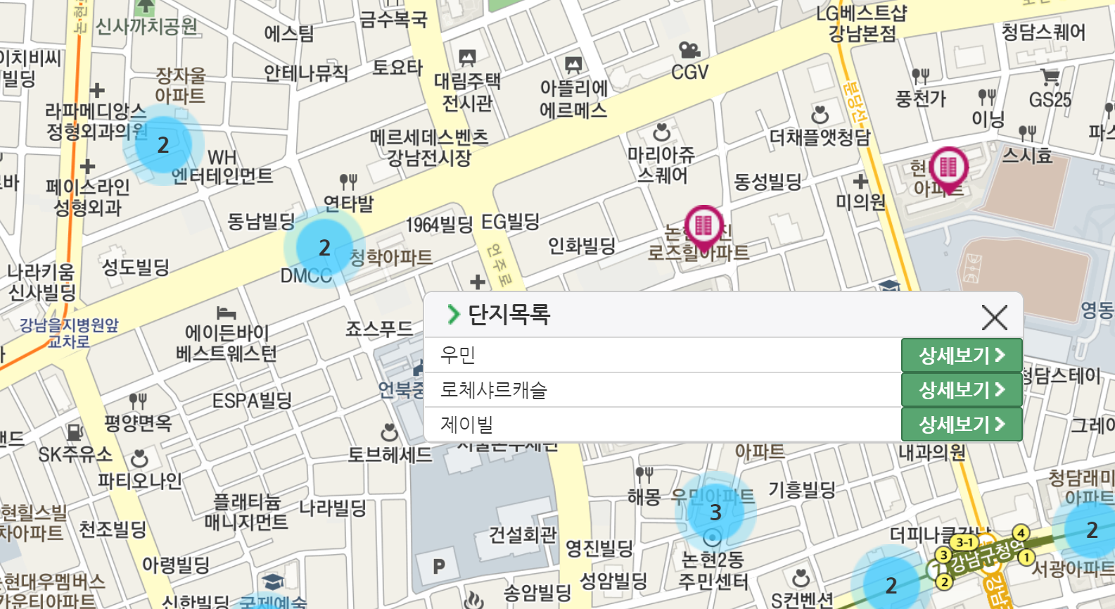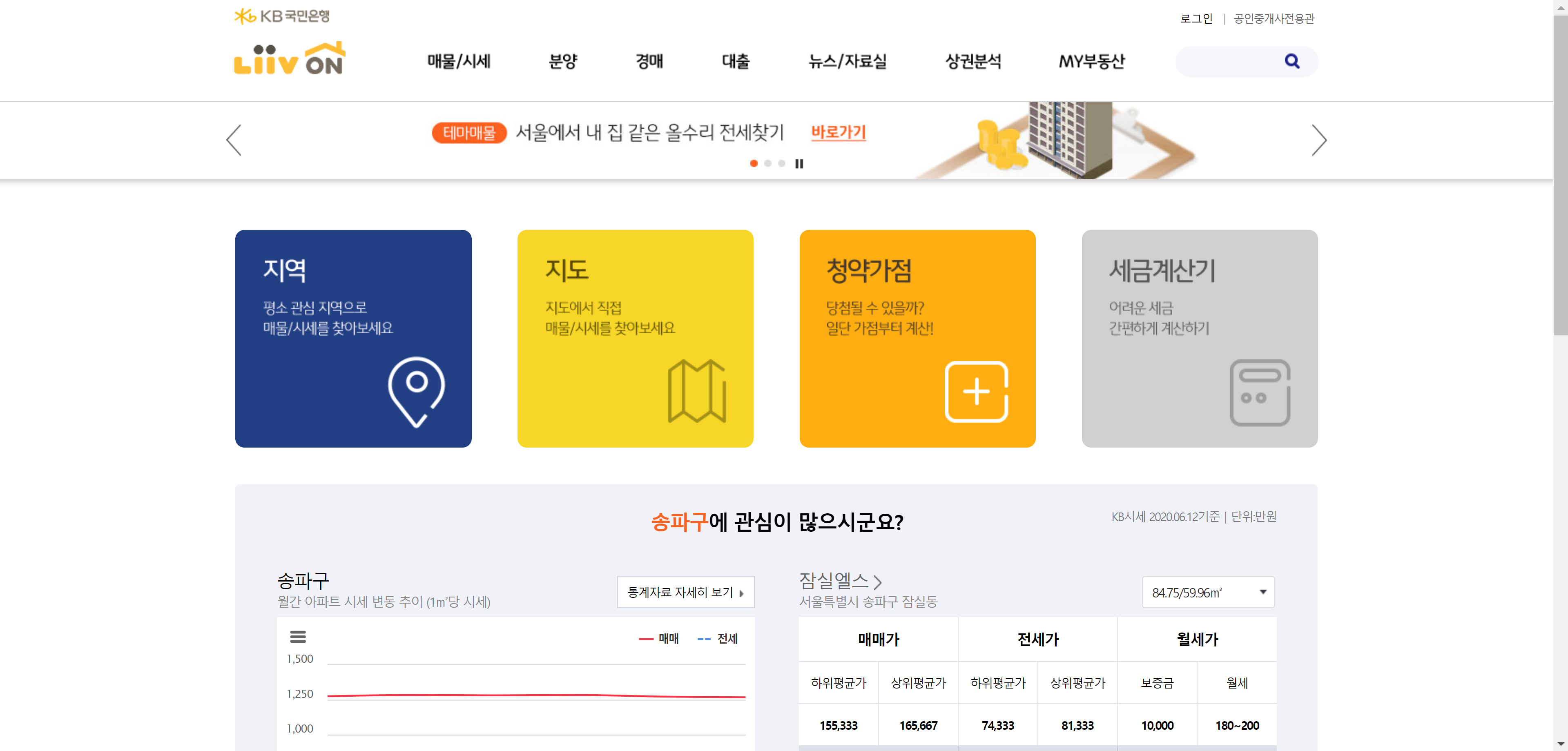 부동산 탭에 들어가시게되면 지역, 지도를 통해 매물과 시세를 알아볼 수 있고 신축 아파트 청약의 경우에도 청약가점 계산도 해볼 수 있습니다. 저희는 일단 지역내에 있는 시세를 한번 알아보도록 할게요