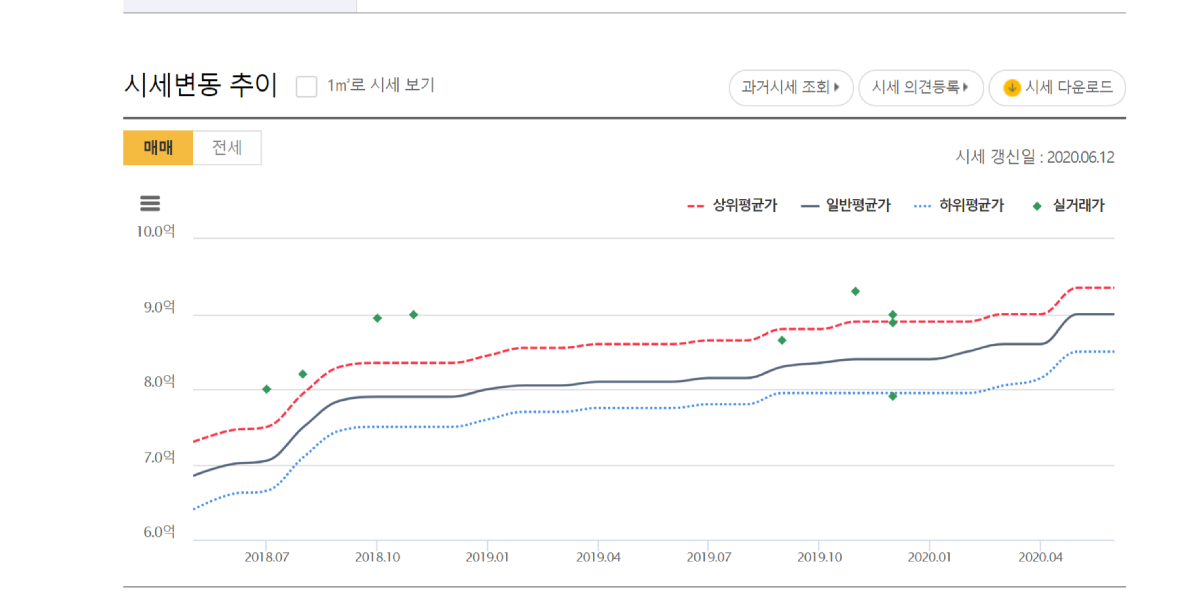 그리고 아래로 스크롤을 내리시면 시세변동 추위로 과거부터 아파트 실거래가의 변동이 어떻게 변화했는지 알수있는 그래프도 있기때문에 이러한 변동폭또한 아파트 시세조회하는데 도움이 될 것 같습니다.