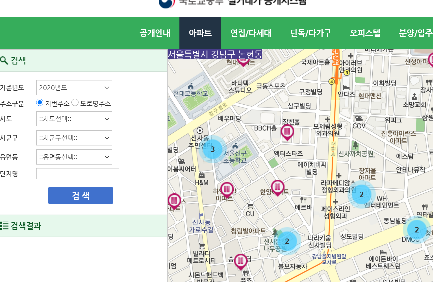 국토부의 홈페이지 또한 앞서 설명드린 국민은행과 마찬가지로 원하는 주거형태의 탭을 눌러주시고 원하시는 지역을 검색하시면 주변 시세가 나옵니다.