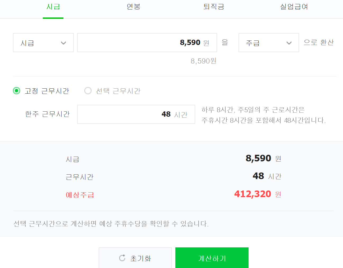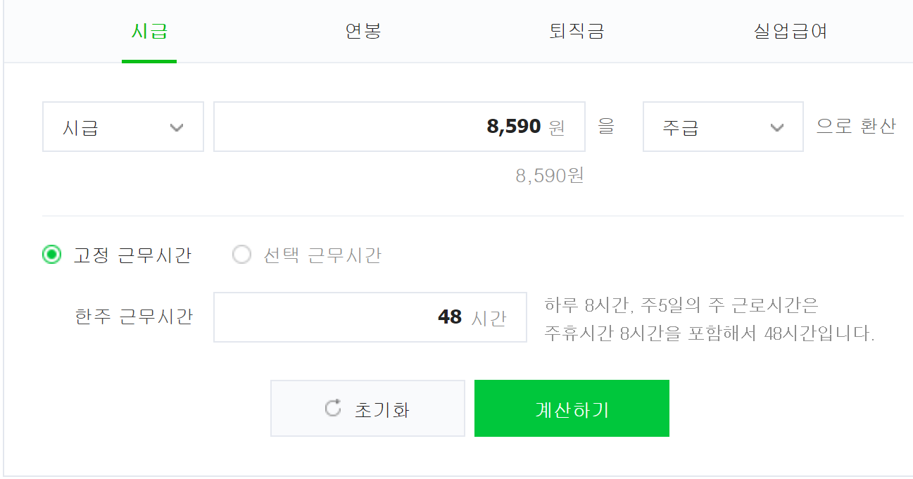 계산기를 잘 살펴보면 시급, 연봉, 퇴직금, 실업급여 등 다양한 임금들을 계산할 수 있고 우리는 시급을 설정해 놓고 월급으로 환산한 다음 근무시간을 입력하고 계산하기를 누르면 기본으로 하루 8시간 주 5일 그로 시간과 주휴 시간 35시간을 포함해서 자동으로 계산을 해줍니다.