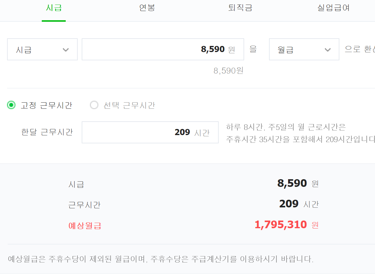 계산을 해보니 최저시급 8590원으로 주5일 8시간과 주휴 시간 35시간 포함한 209시간으로 계산했을 때 1달 최저임금은 1,795,310원입니다.