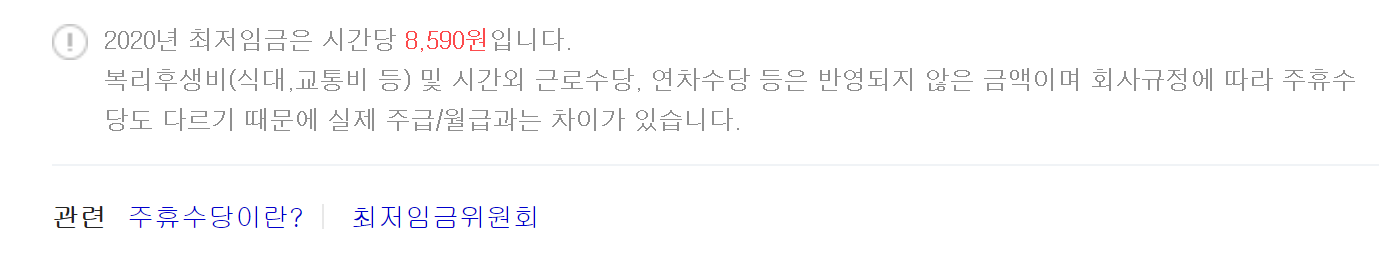 현재 2020년도의 지정된 최저임금은 시간당 8590원입니다. 작년에는 8350원이었는데 240원 정도 상승하였습니다.