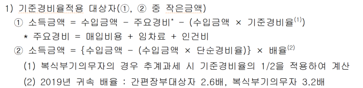 ① 소득금액 = 수입금액 - 주요경비* - (수입금액 × 기준경비율(1))
