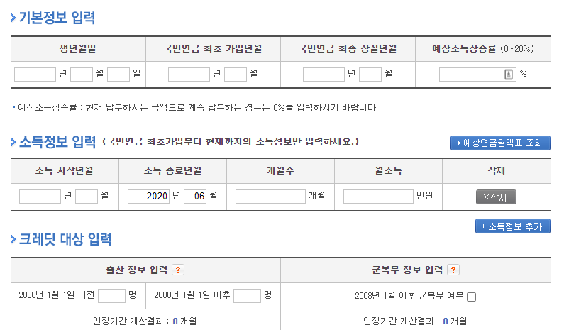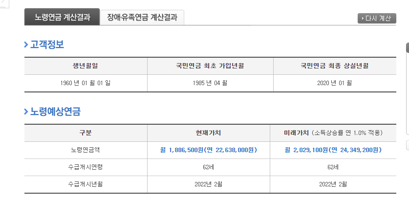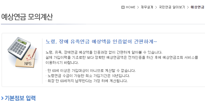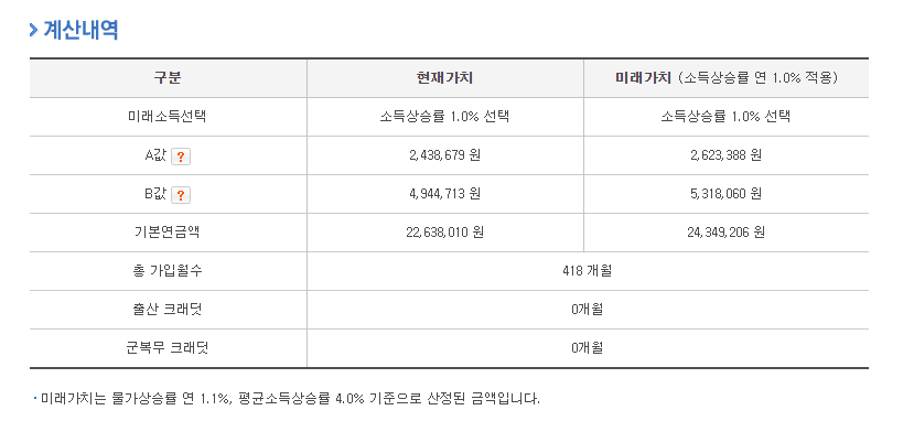 앞서 말씀드린 것은 우선 국민연금 가입기간이 전부 충족이 되지 않으신 분들이고 국민연금 납부기간을 최소 이상 충족하신 분이라면 조금 더 정확한 미래가치 예상 연금액을 확인하실 수 있습니다.
