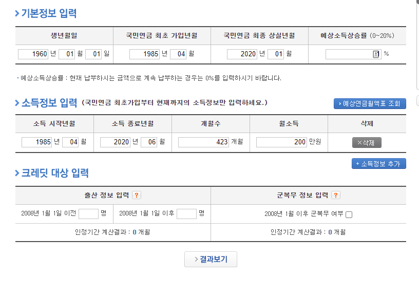 생년월일과 국민연금 최초 가입 연월을 입력하면 최종 상실 년월은 자동으로 입력됩니다 여기서 월소득만 입력 후 결과 보기 버튼을 누르시면 내 예상 연금 금액이 나옵니다.