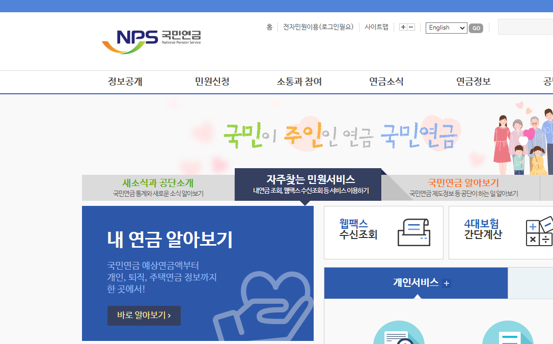 1. 우선 국민연금공단(https://www.nps.or.kr/jsppage/main.jsp) 홈페이지에 들어가셔야 됩니다.
