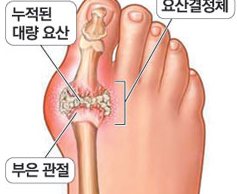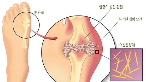 위와 같은 원인으로 요산이 과다하게 축적되면 결정체를 이루게 되고 관절이나 연골에 축적되어 통증이 발생됩니다.