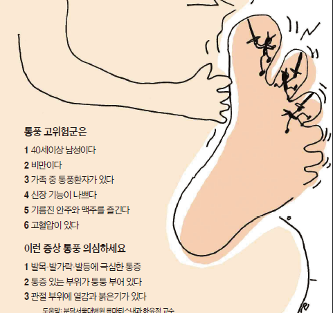 또 과다한 음주와 비만, 당뇨, 고혈압 등이 통풍을 일으키는 주원인이니 조절하셔야 합니다.