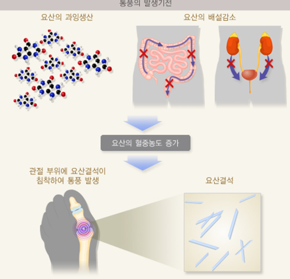 통풍은 기본적으로 요산이 체내에 점차 축적되어서 생기는 질병입니다. 이 요산이 여러가지의 원인 때문에 배출되지 못하고 보통 발가락이나 관절 주변에 축적되어 통풍증상을 일으킵니다.