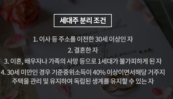 3. 30세 미만의 경우 중위소득40% 이상 거주지 주택 관리, 유지가 가능하고 독립된 생계유지가 가능한 19세 이상의 성인