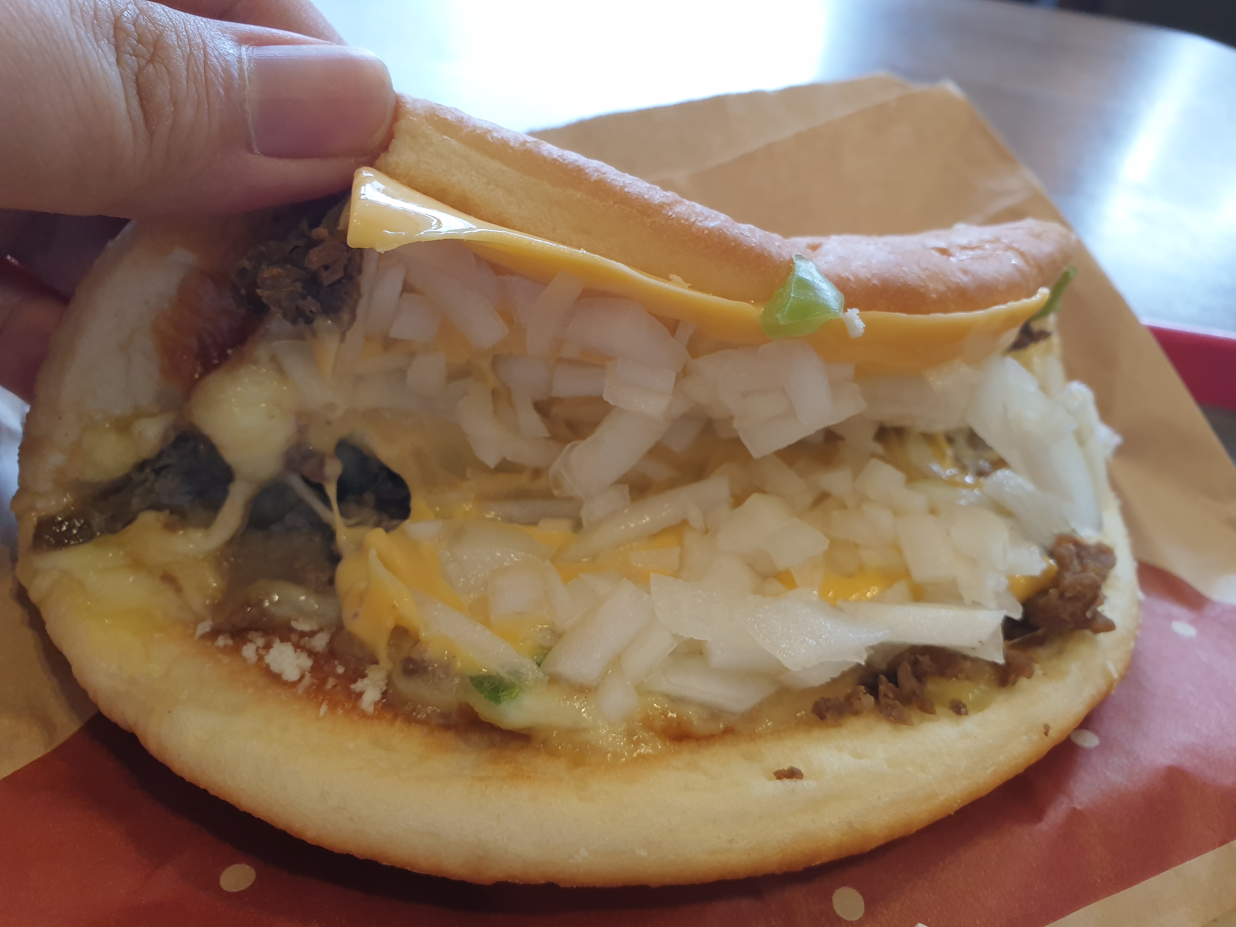 저는 롯데리아 접는 버거 폴더 버거 종류 중 비프버거를 시켰는데요. 제가 딱 받아서 열어 봤을 때 느낀 점은 양파가 가득하네란 생각이었습니다. 솔직히 사진은 푸짐하게 넣는다는 것을 알고 있었지만 생각보다 내부에 고기가 많이 보이기보다 양파만 보였습니다.
