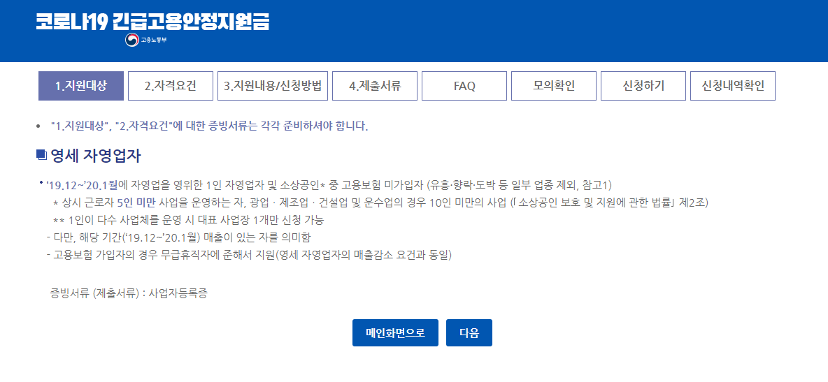 총 7단계를 거쳐서 코로나 19긴급 고용안전 지원금 신청을 할 수 있습니다.