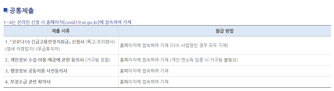 위의 4가지가 공통적인 제출서류이고 홈페이지에 가시면 간단히 작성하실 수 있습니다. 긴급 고용안전 지원금 신청 4개의 직종에 따라서 세부 서류는 조금 달라지게 됩니다.