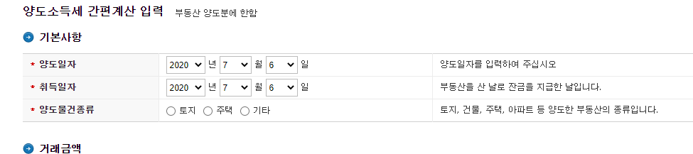 4. 양도일자, 취득일자, 양도물건종류를 입력해주세요