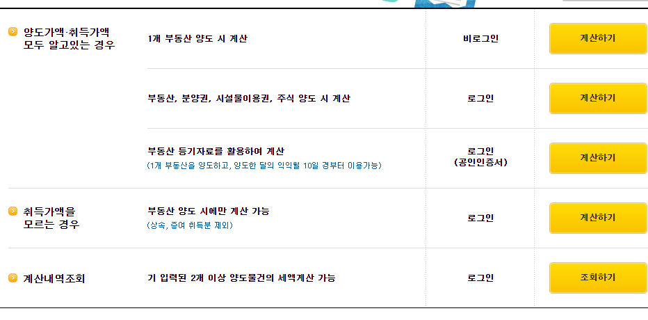 양도소득세 자동계산의 경우 1개의 부동산 양도 시에는 로그인할 필요가 없지만 부동산 등기자료 활용 계산이나, 주식 양도, 시설물 이용권의 경우는 로그인을 하셔서 확인하시면 됩니다.