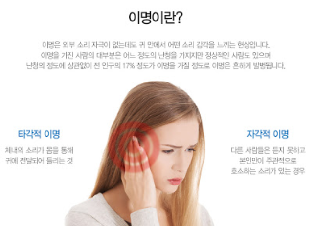 이명이란 한자어대로 외부의 청각적인 소리가 없는 상태에서 들리는 소음입니다. 이 이명증상은 한쪽귀에만 생길수도 있고 양쪽 귀 전부에서 들릴 수도 있습니다.