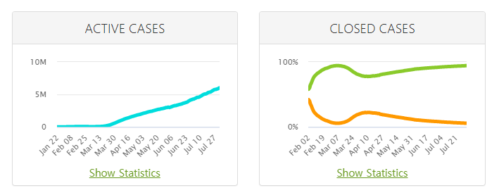 현재 전체 코로나바이러스 확진자 수는 1809만 5979명입니다. 그 중 사망자 수는 69만 40명이고 코로나 바이러스 회복된 인원은 1137만 5443명입니다.