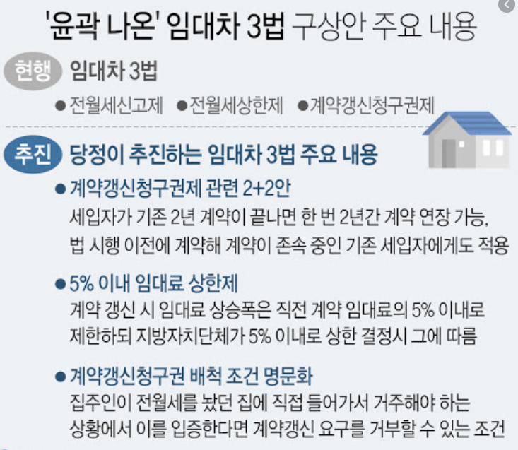 전월세 상한제는 임차인과 임대인의 계약 갱신시에 보증금의 금액을 제한하는 법안인데요. 전월세 인상률을 5% 이내로 하는 법안입니다.