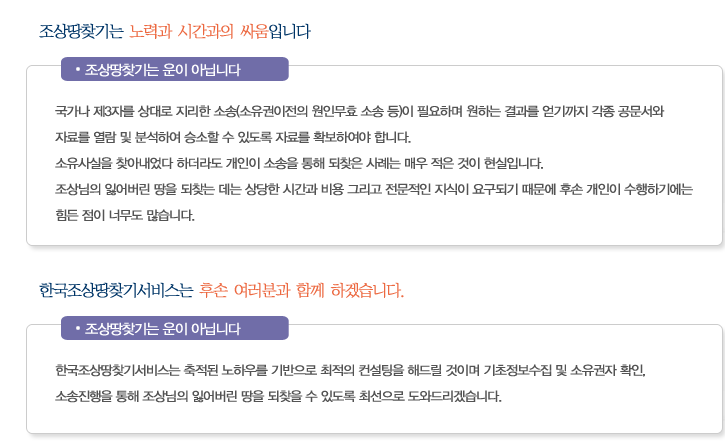 조상땅찾기 조회방법은 운으로 찾는 것이 아닙니다. 조상땅찾기 서비스로 통해 기본적인 정보를 확인 후 국가나 제 3자를 상대로 소송을 해야하고, 승소하기 위해 많은 공문서와 자료를 확보해야 합니다.