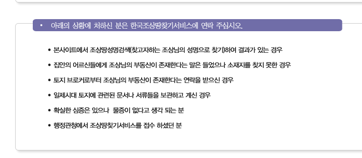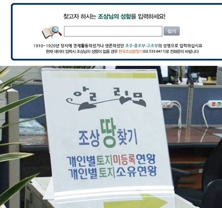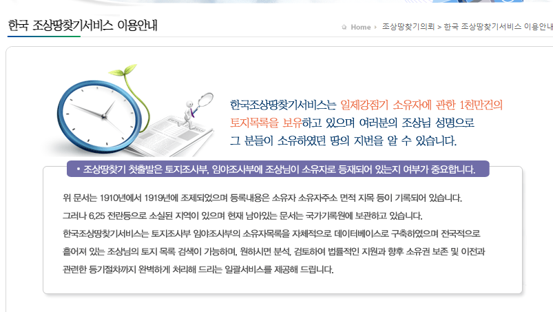 한국 조상땅찾기서비스 홈페이지를 통해서인데요. 한국조상땅찾기 서비스 홈페이지는 일제강점기 소유자에 대한 1천만건의 토지목록을 보유하고 있어서, 검색을 통해 그분들이 소유했던 땅의 지번을 확인할 수 있다고 합니다.