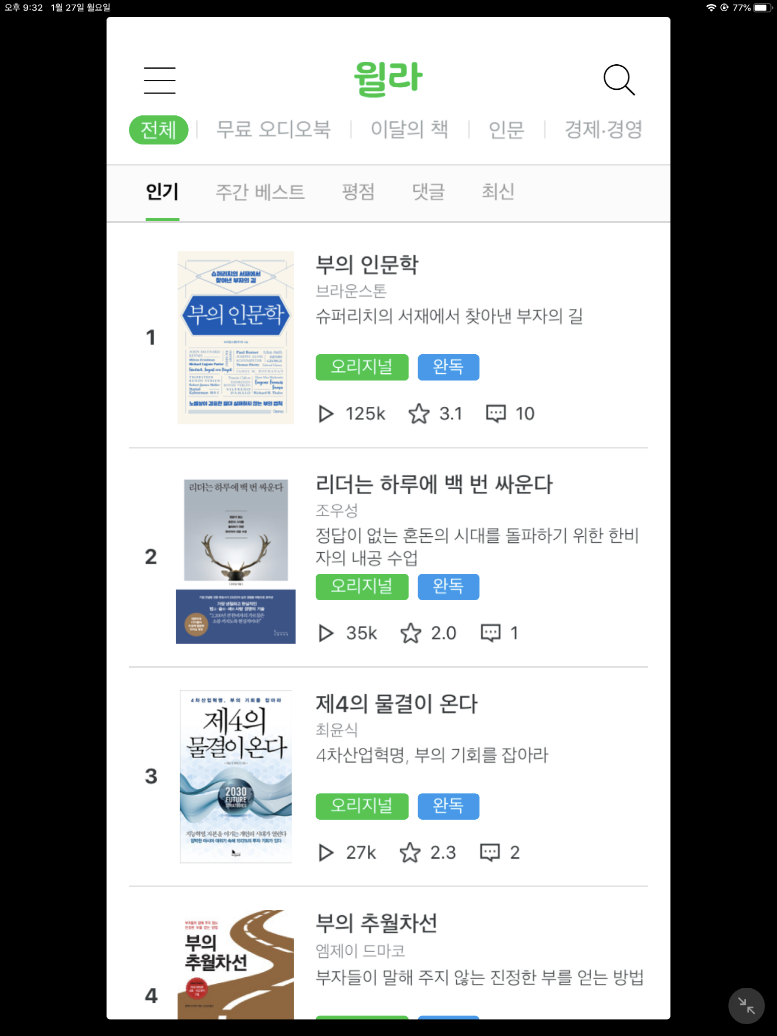 인문학, 경제, 자기 계발, 에세이, 고전, 소설, 영어 오디오북 등 많은 분류의 책들이 포진해 있고 완독 하기에는 시간이 조금 모자라시다 하는 분들을 위해 요약본들도 있습니다.