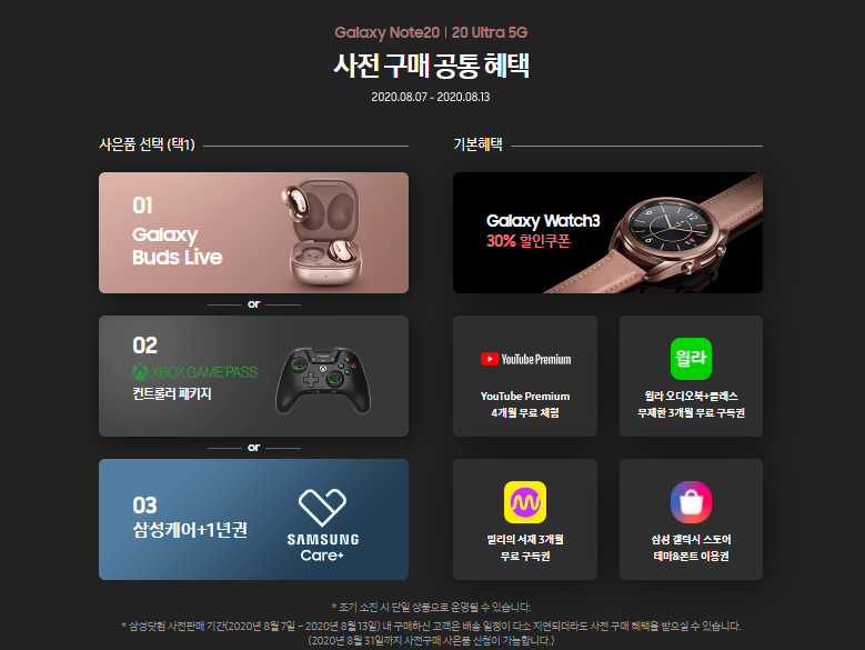 저는 현재 선택약정 2년의 금액으로 할부원금 100만원 초반대의 구매금액으로 갤럭시노트 20 울트라를 구매하였습니다.여기다가 사전예약 사은품으로 갤럭시 버즈라이브 혹은 갤럭시 케어 등과 같은 서비스를 1가지 선택할 수 있는데요.