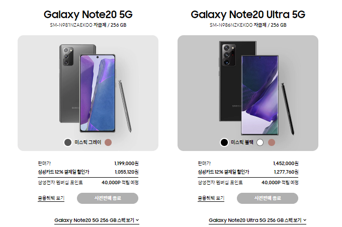 갤럭시노트 20과 갤럭시노트20 울트라의 출시가는 각각 1,199,000원과 1,452,000원입니다.
