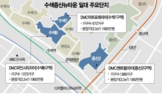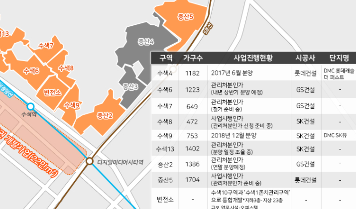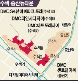 현재 DMC센트럴자이와 DMC아트포레자이, DMC파인시티자이, DMC SK뷰 아이파크를 수색증산뉴타운의 물량이라고 보시면 될 것 같습니다.