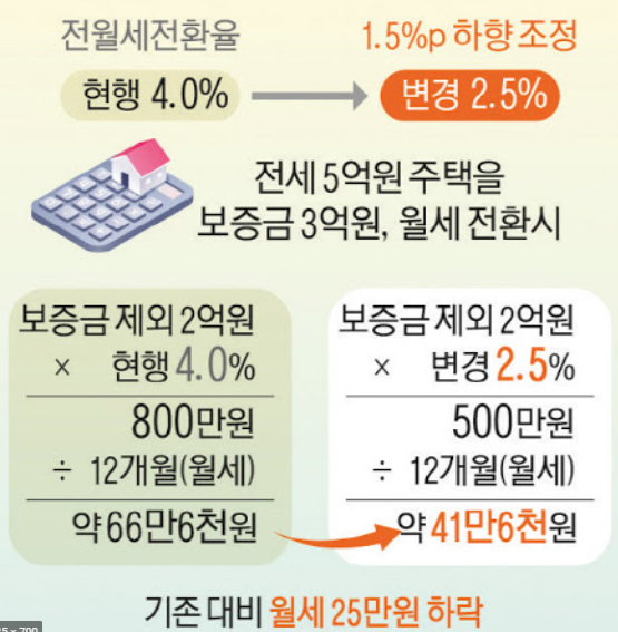현재 10월부터는 현행 4%인 전월세 전환율 상한이 2.5%로 낮아질 것으로 개정안이 입법이 되었습니다.