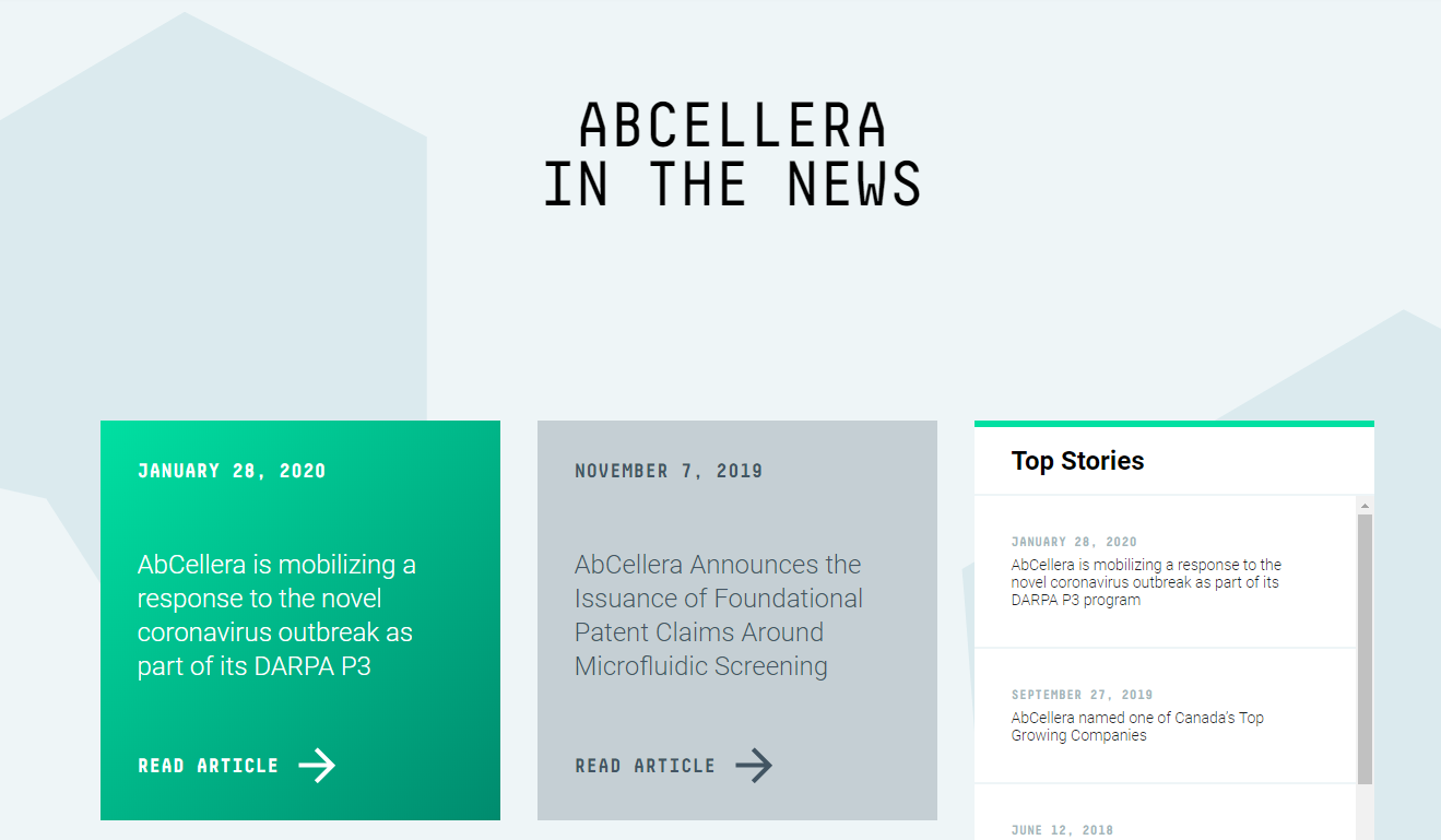 Abcellera는 바이러스를 중화시키고 전파를 차단할 수 있는 항체를 식별하기 위해 노력하고 있습니다. Abcellera는 2018년부터 전염병 예방 프로그램에 따라서 알 수 없는 바이러스 병원체가 분리된 후 60일 이내에 현장에서 준비된 의료 대책을 개발할 수 있는 전염병 대응기술 플랫폼을 개발하고 있습니다.