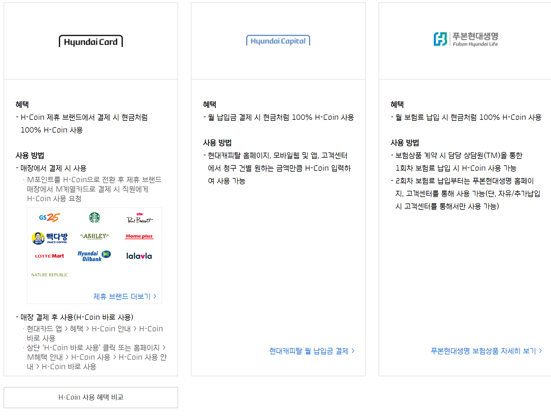 M포인트 항목 중에 H코인 사용안내 항목이 있습니다 이 부분을 클릭하시게 되면 제휴 브랜드 안내 창이 나옵니다. 이제 그곳에서 'H-Coin 사용 혜택 비교'라고 작게 적힌 항목을 눌러줍니다.
