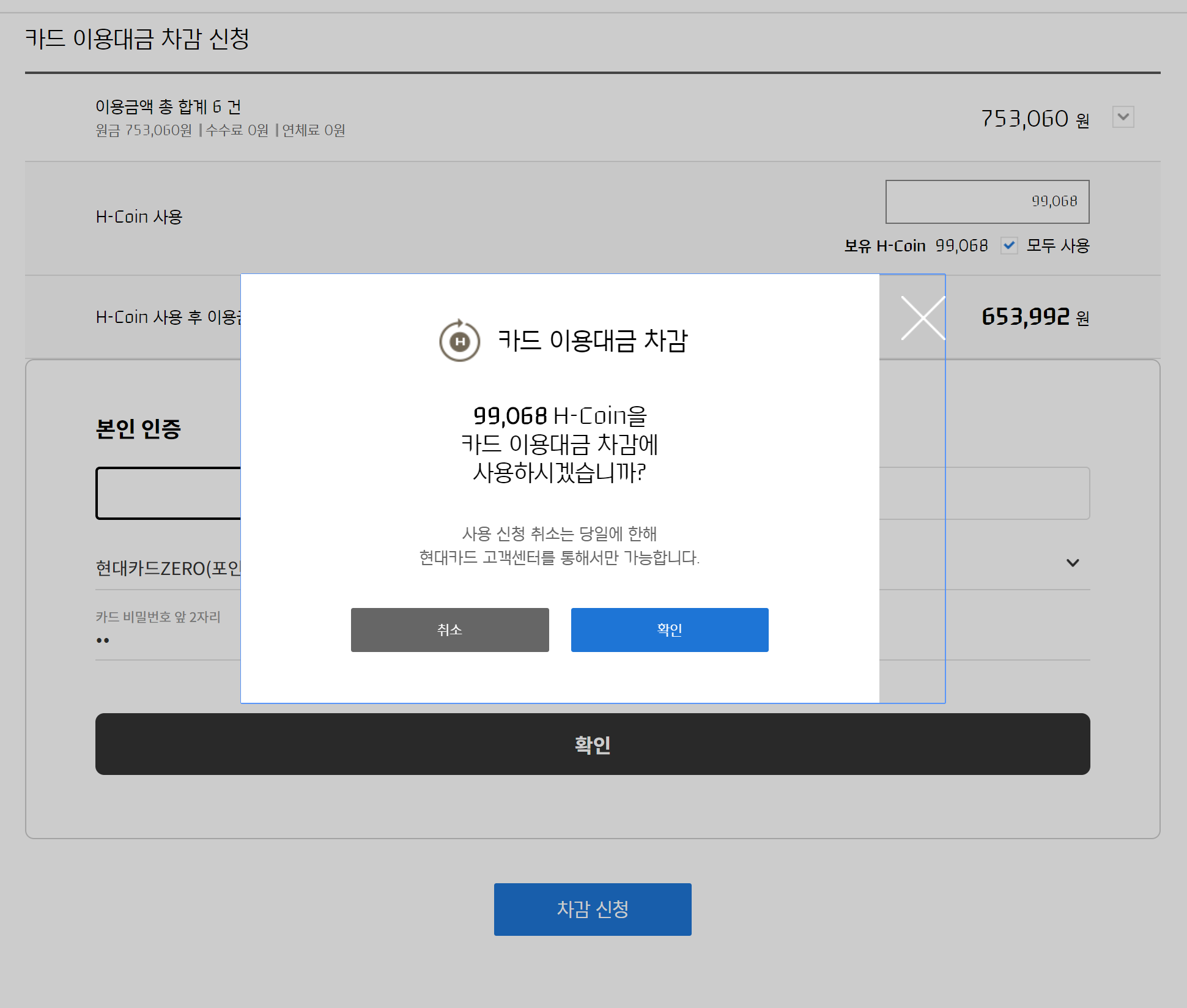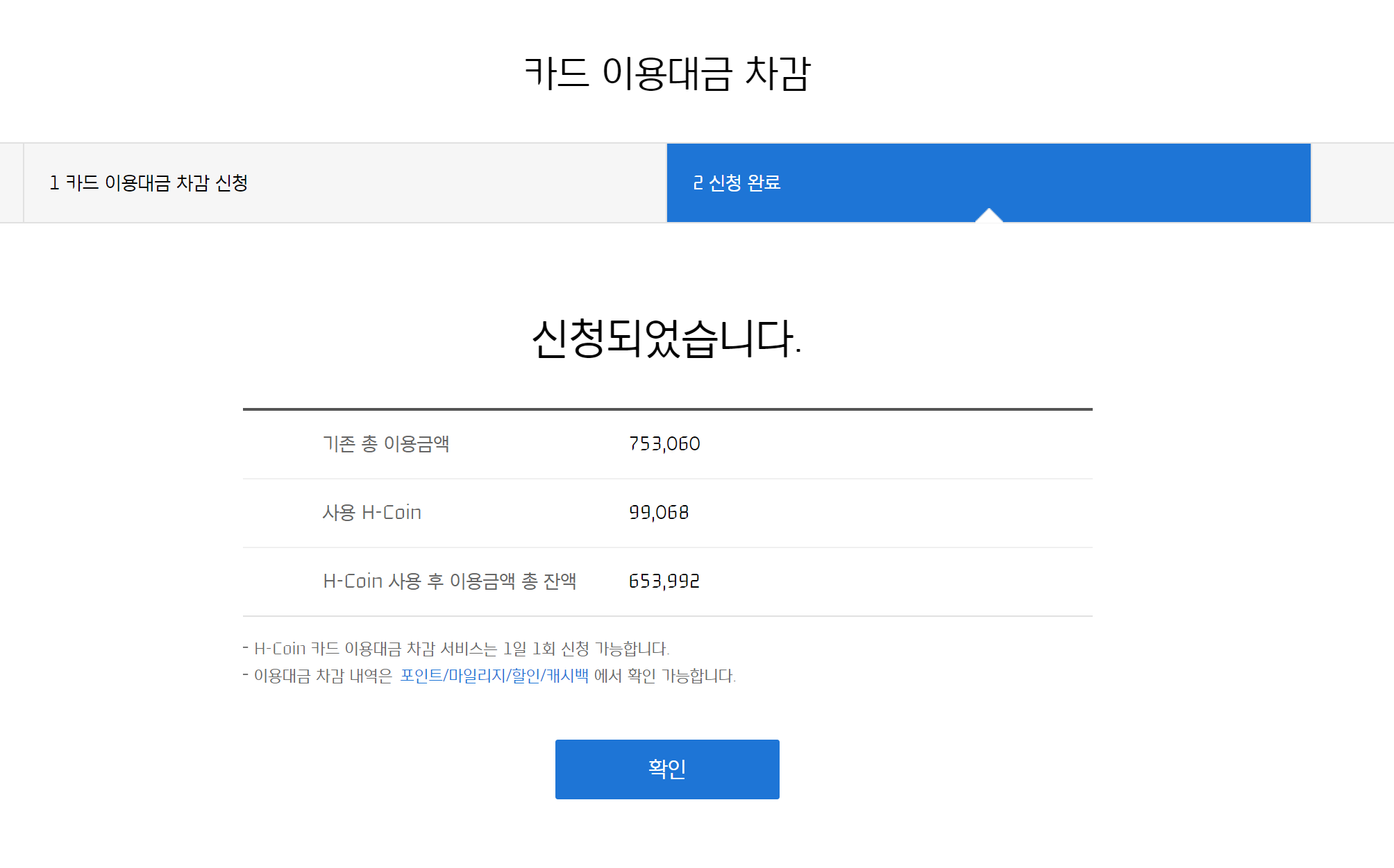 H코인을 이용해 카드 이용대금 차감은 1일 1회 신청 가능하니 잘못 누르시더라도 다음날 다시 진행하시면 될 것 같습니다.