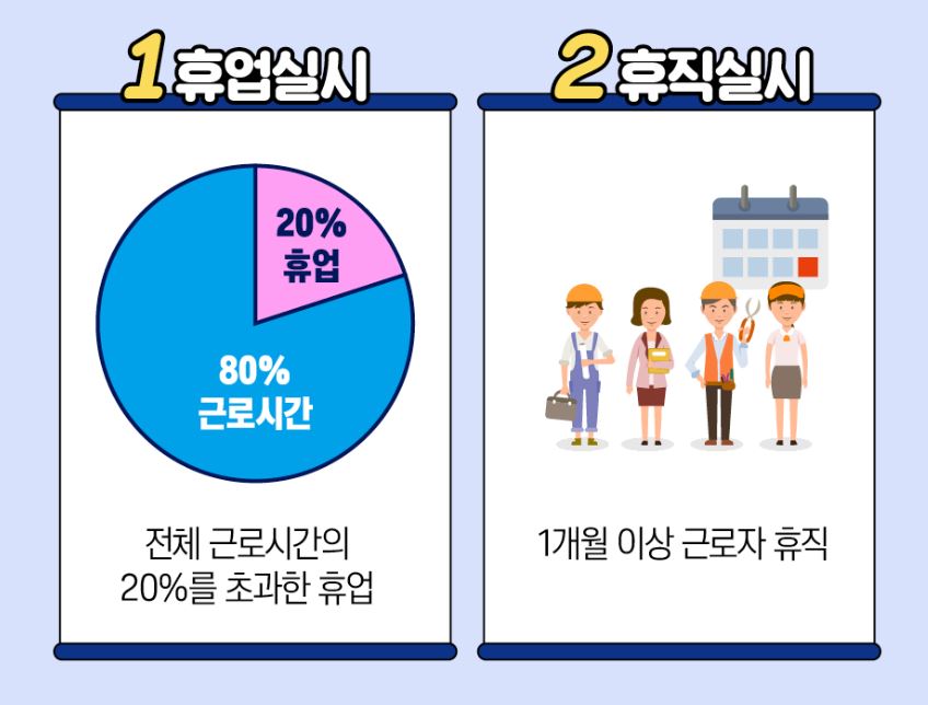 휴업의 경우 지원조건은 1개월 단위의 전체 고용보험 피보험자의 총 근로시간의 20%을 초과하여 근로시간을 단축하는 조치를 행하고, 휴업수당을 지급한 사업주 지급한 사업주라면 휴업에 대한 지원을 받을 수 있고 지원 수준은 사업주가 근로자에게 지급한 휴업수당의 2/3까지 지원받을 수 있습니다.
