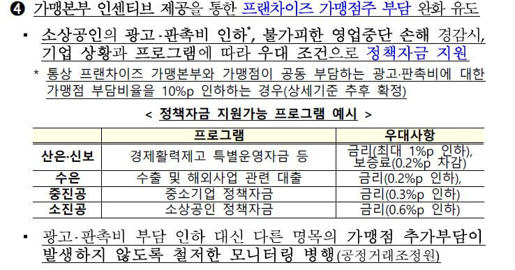 가맹본부 인센티브 제공을 통한 프랜차이즈 가맹점주 부담 완화 정책에서는 소상공인의 광고 판촉비 인하 및 불가피한 영업중단으로 인한 손해 경감 시 기업 상황과 프로그램에 따라 우대조건으로 정책자금을 지원받을 수 있습니다.