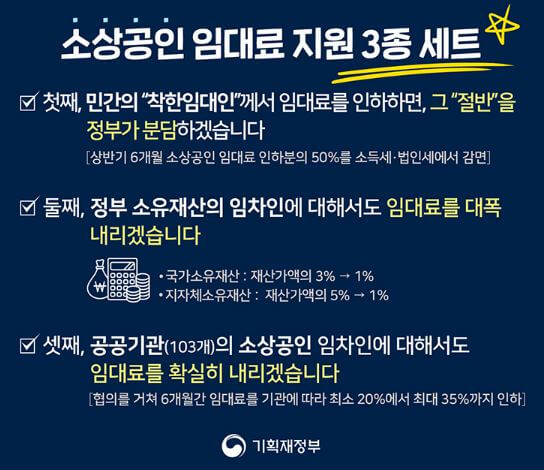 소상공인 및 중소기업의 피해 회복기반을 마련하기 위한 정부 정책인 소상공인 임대료 지원 3종 세트에 대해서 말씀드리겠습니다.