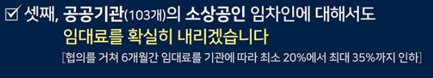 공공기관(103개 기관 참여) 소유재산의 소상공인을 위한 임대료 인하 정책입니다. 철도역 구내 매장, 공공주택 단지 내 상가, 공항 내 매점, 고속도로 휴게소 등의 임대시설을 말합니다.