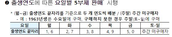 - 요일별 구매 5부제 (출생 연도 끝자리)