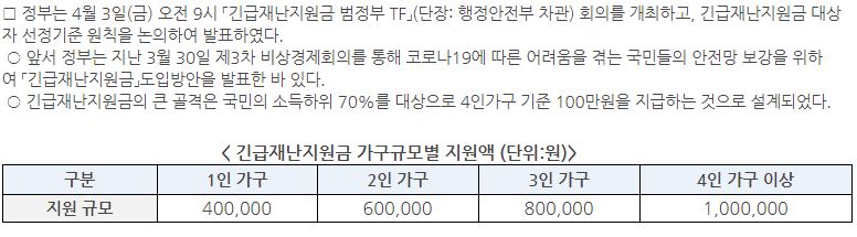 하지만 이 긴급재난지원금을 대한민국 국민 모두가 받을 수 있는 것은 아닙니다. 지급기준은 대략적으로 소득 하위 70% 이하를 기준으로 발표했는데요.