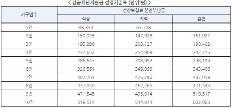긴급재난지원금의 선정 기준으로는 건강보험료를 기준으로 소득분위를 나눌 수 있는데요 위의 표와 같이 가구원수에 따른 건강보험료 본인부담금 금액을 참고하시면 대략적으로 내가 지원대상인지 확인할 수 있습니다.