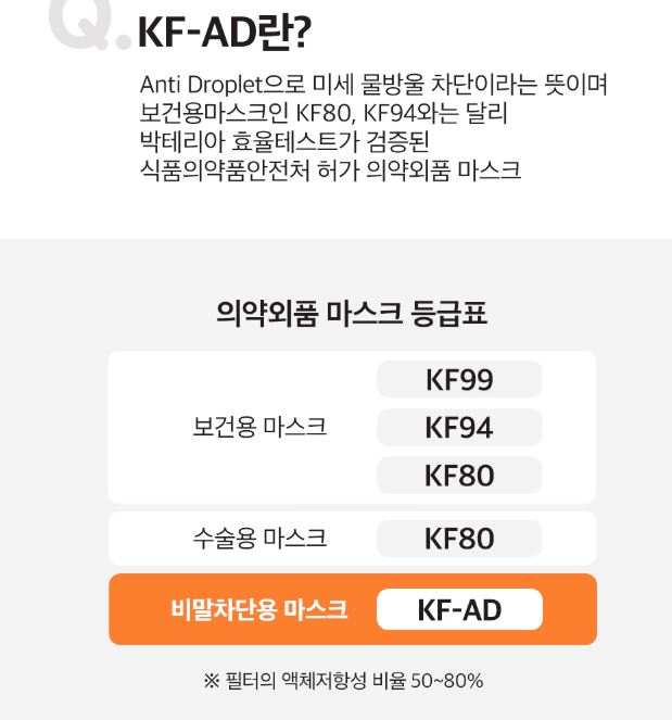 그래서 우리가 많이 보았고 평소에 썼던 것은 KF80,94인데 이런 보건용 마스크와 달리 박테리아 효율 테스트가 검증된 식약처 허가 마스크가 KF-AD 비말 차단용 마스크입니다.