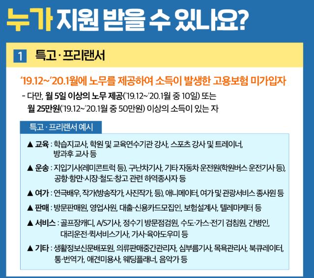19.12~20.1월에 소득이 발생했지만 고용보험 미가입한 인원을 기준으로 합니다. 직종 예시는 위의 사진을 참고하시면 되는데 대부분의 직종이 가능한 것으로 보입니다.