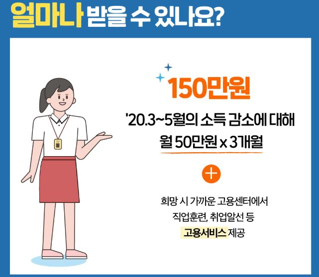 긴급고용안정 지원금은 총 150만원을 지원해줍니다. 이는 20.3~5월의 소득감소에 대해 월 50만원씩 3개월을 지원해주는 내용입니다. 추가로 고용센터에 가서 직업훈련과 취업알선등과 같은 고용서비스 또한 받아보실 수 있습니다.
