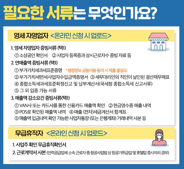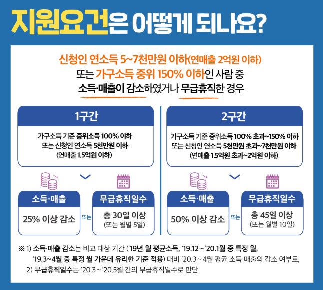 지원요건은 신청인의 연소득이 5~7천만 원 이하 (자영업자 연매출 2억 원 이하) 또는 가구소득 중위 150% 이하인 사람 중에서 소득 또는 매출이 감소하였거나 무급 휴직한 경우입니다.