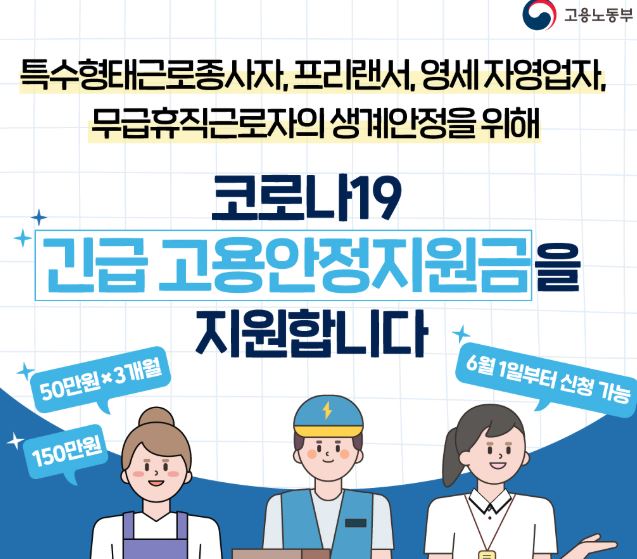이 정책은 지난 6월 1일부터 신청자를 받았는데요. 대략적인 지원내용은 특수형태 근로종사자, 프리랜서, 영세 자영업자, 무급휴직근로자들을 위한 지원금이고 1개월간 50만 원 총 3개월 동안 150만 원을 받을 수 있습니다.