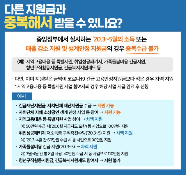 일단 긴급재난지원금과, 자치단체 재난지원금, 자치단체 소상공인 생계안전 사업 등은 전액 지원받을 수 있고, 지역고용 대응 특별지원, 취업성공 패키치, 가족 돌봄 등은 차액 지원입니다. 하지만 청년 구직활동 지원금과 긴급복지지원제도에 대해서는 지원 불가이니 확인 부탁드립니다.