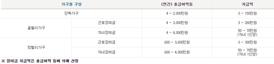또 소득요건과 재산요건을 충족해야 하는데 소득요건은 가족 구성원에 따라 총소득 금액 단독 2천만 원, 홑벌이 3천만 원, 맞벌이 3천6백만 원 미만이 되어야 하고 소득 금액에 따라 지급액이 달라집니다.