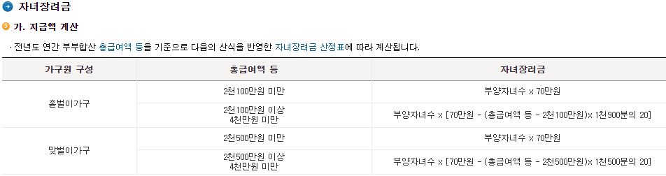 자녀장려금 또한 같이 묶여있는 국세청 지원중 하나로 자녀양육을 지원하기 위해 부부합산 총소득이 4000만 원 미만이면서 부양자녀(18세 미만)가 있는 경우 최대 1명당 70만 원씩 지급하는 제도입니다.