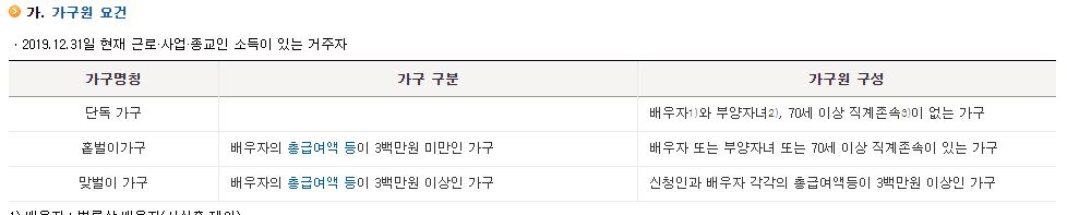 각 지원제도는 가구원 요건을 필요로 하는데 첫째 단독가구, 둘째 홑벌이 가구, 셋째 맞벌이 가구로 가구 구분은 위의 표를 참조 부탁드립니다.